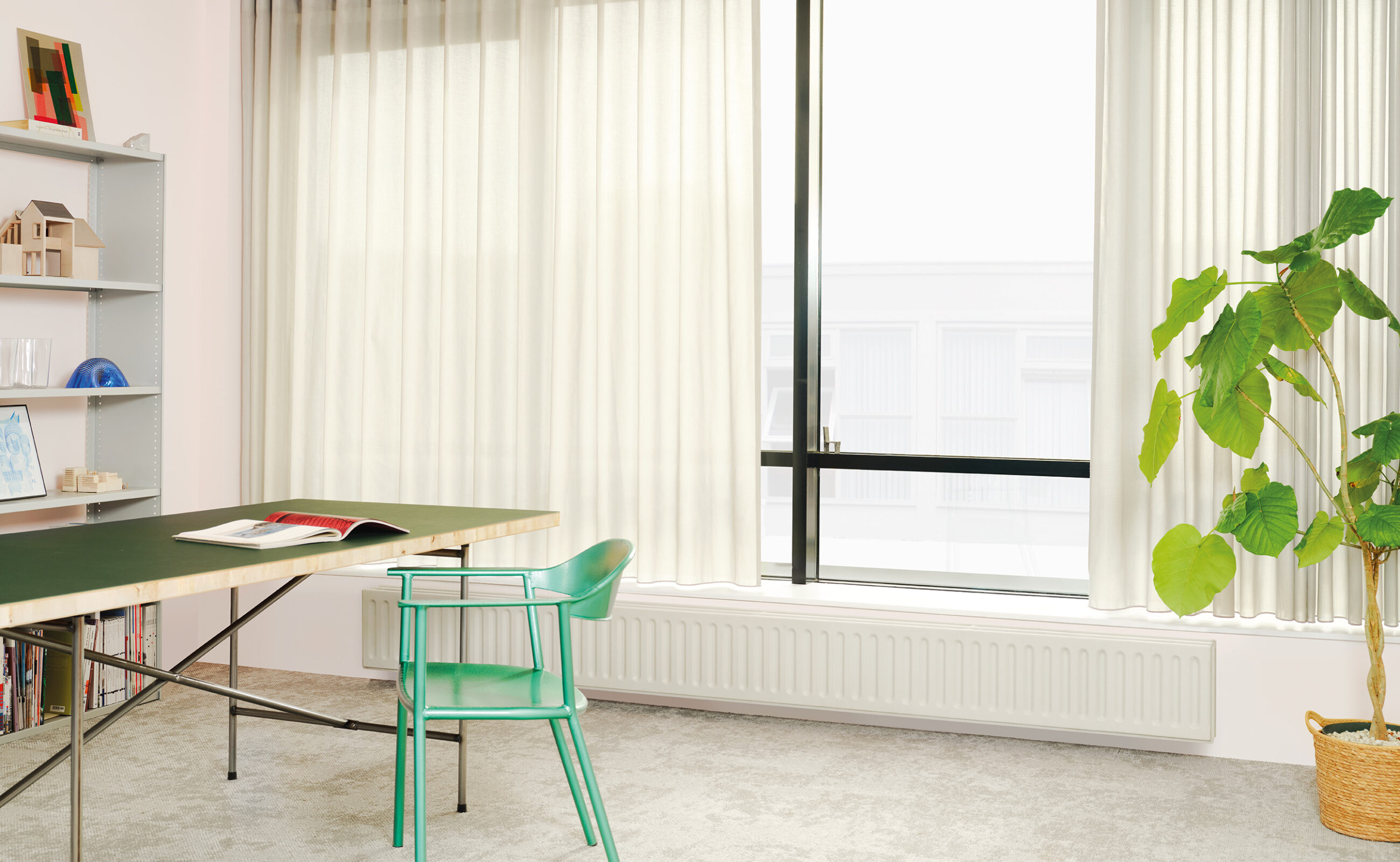Zinc is an in-between woven curtain fabric with a unique woven-in yarn that provides a reflective backing. Because of the special yarn, it allows for regulating daylight in the room, enabling you to create a pleasant indoor climate. ZINC is made with 75% pre-consumer recycled Trevira CS fibres.